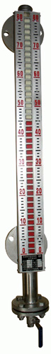 结构见图,有简体、浮子、浮子室、法兰、放气螺栓。指示器,传感器等部分组成。它经上、下过程连接法兰安装于容器的侧面,根据浮子重量和浮子排开液体体积重量相等的原理。使装有磁钢的浮子在被测介质中随游液位的变化而上下移动,浮子内磁钢驱动显示部分,当液位上升时将它翻成红色一面向外,当液位下降时将它翻成白色一面向外,远传部分是将传感器安装于浮子室外侧,由浮子内磁钢驱动传感器部分发生动作信号,显示仪表或控制箱安装于控制室内,使操作人员及时正确的掌握液位的变化情况。