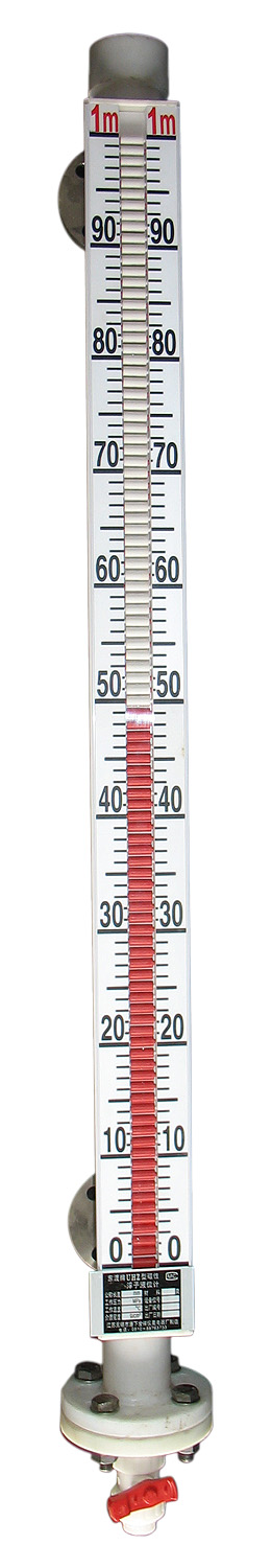 结构见图,有简体、浮子、浮子室、法兰、放气螺栓。指示器,传感器等部分组成。它经上、下过程连接法兰安装于容器的侧面,根据浮子重量和浮子排开液体体积重量相等的原理。使装有磁钢的浮子在被测介质中随游液位的变化而上下移动,浮子内磁钢驱动显示部分,当液位上升时将它翻成红色一面向外,当液位下降时将它翻成白色一面向外,远传部分是将传感器安装于浮子室外侧,由浮子内磁钢驱动传感器部分发生动作信号,显示仪表或控制箱安装于控制室内,使操作人员及时正确的掌握液位的变化情况。